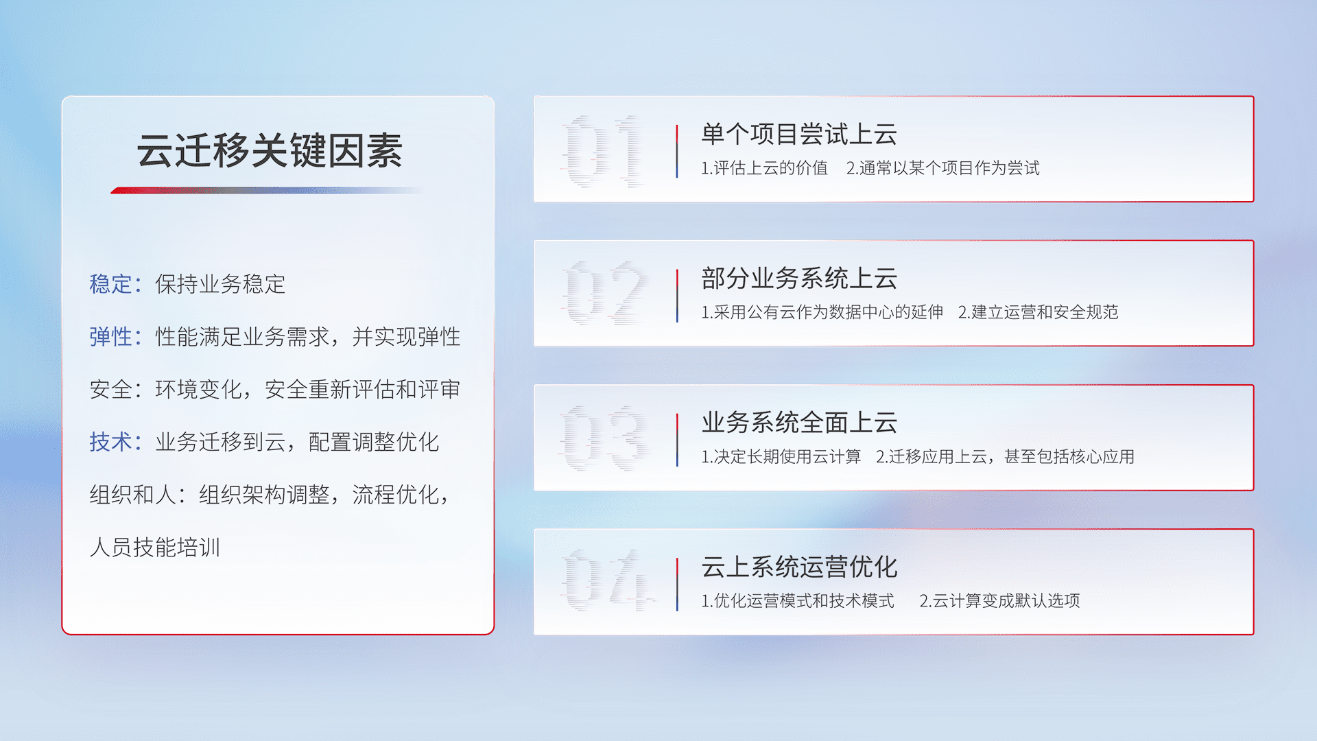结合实际业务,,,,从规划设计、、、云平台选型、、云原生改造、、、、数据迁移、、、、集成交付,,,迁移全过程为客户识别最佳上云路径,,,,做好风险识别管理,,设计网络架构、、、、身份权限、、、安全审计合规、、、、操作审计、、、日志审计、、、监控告警策略、、、多站点容灾设计等,,,对云上基础设施进行整体规划,,,提升IT治理水平,,,,以满足弹性、、、高可用、、、、高性能的需求。。。